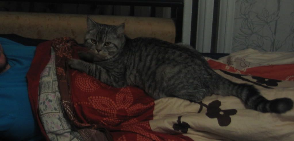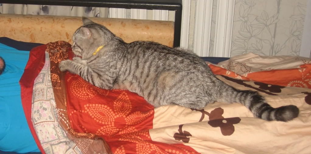А коварный муж ходит в туалет. И тогда Федя страдает под дверью. А ночью, когда объект любви спит, Федор приходит любоваться. Сядет рядом и смотрит. Положит лапищу на грудь - мое! Это чтобы я не претендовала. Иногда может меня и лапой пхнуть. Или прыгнет объекту на живот и подползааааает к лицу. Думаете, целоваться? Не, он же мужЫк. Опять смотреть.