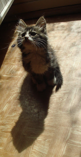 Зверь обожает ловить на экране поинтер мышки и спать на клавиатуре, узнает себя в зеркале и писается исключительно в коробку (пока не купили лоток).